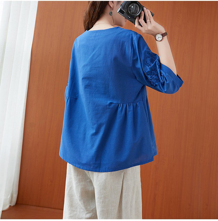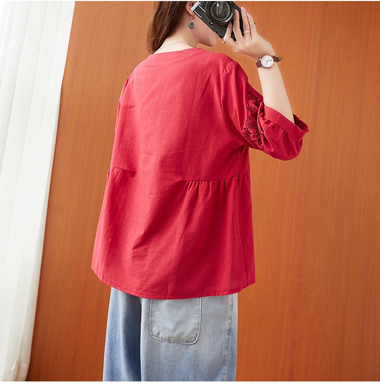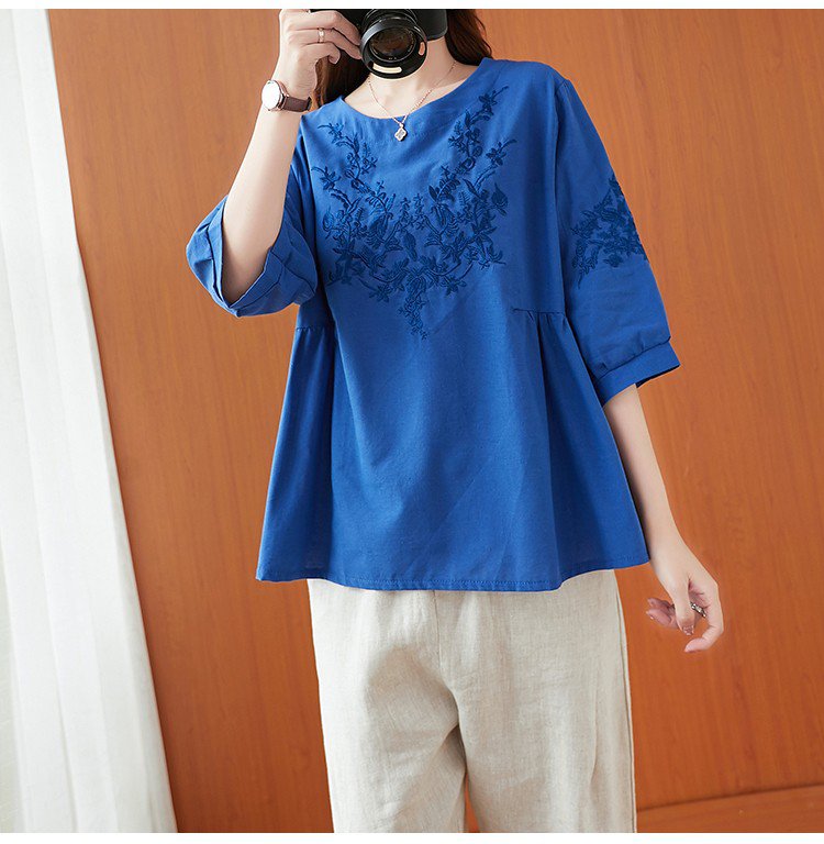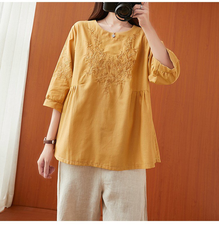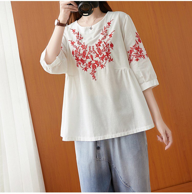 เสื้อยืดผ้าคอตตอนลินินผู้หญิง ปักลาย ทรง A